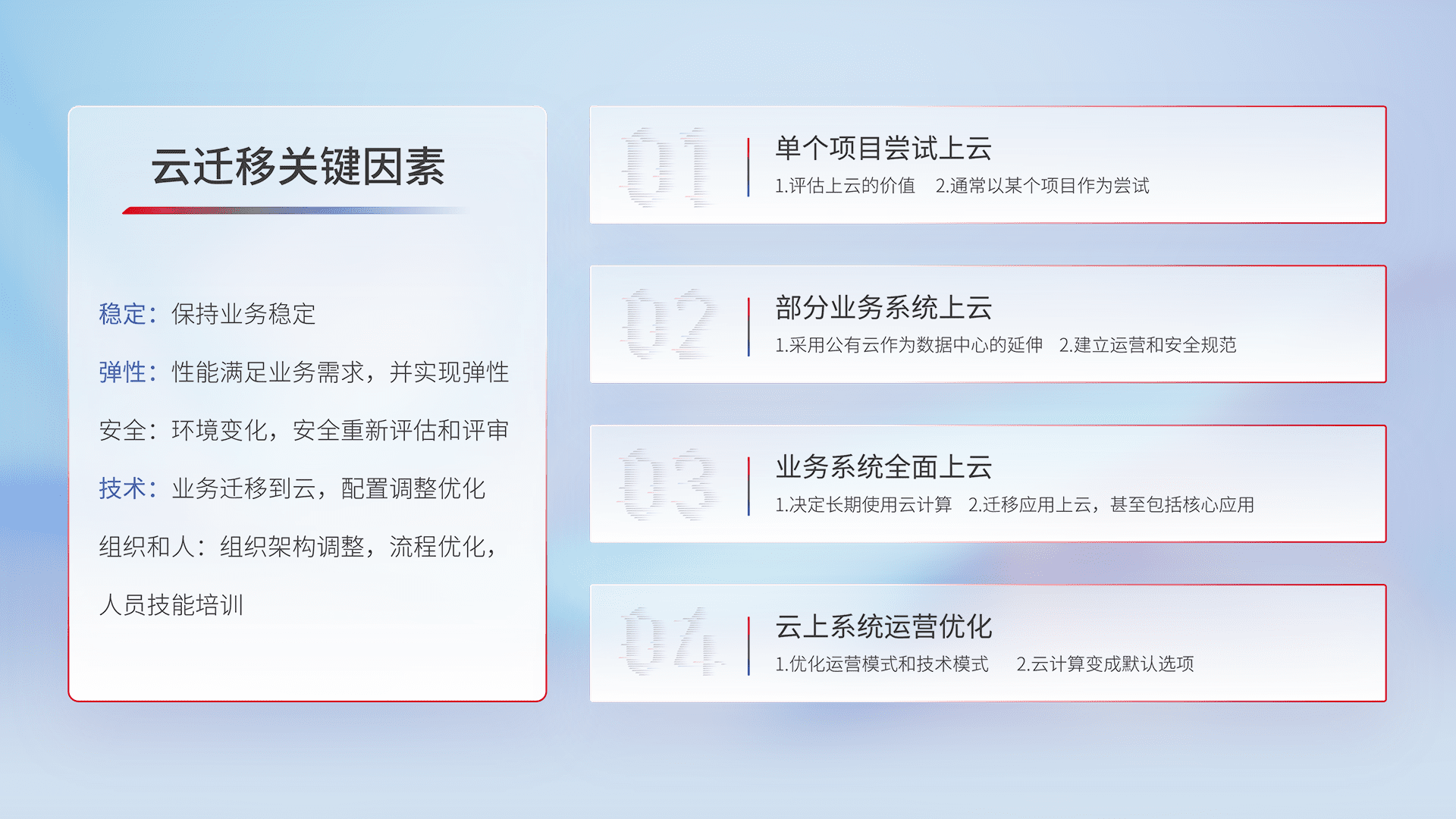 结合实际业务,,,,从规划设计、、云平台选型、、云原生改造、、、、数据迁移、、、集成交付,,,,迁移全过程为客户识别最佳上云路径,,做好风险识别管理,,,设计网络架构、、身份权限、、、、安全审计合规、、、操作审计、、日志审计、、、、监控告警策略、、、、多站点容灾设计等,,对云上基础设施进行整体规划,,提升IT治理水平,,,,以满足弹性、、高可用、、、高性能的需求。。