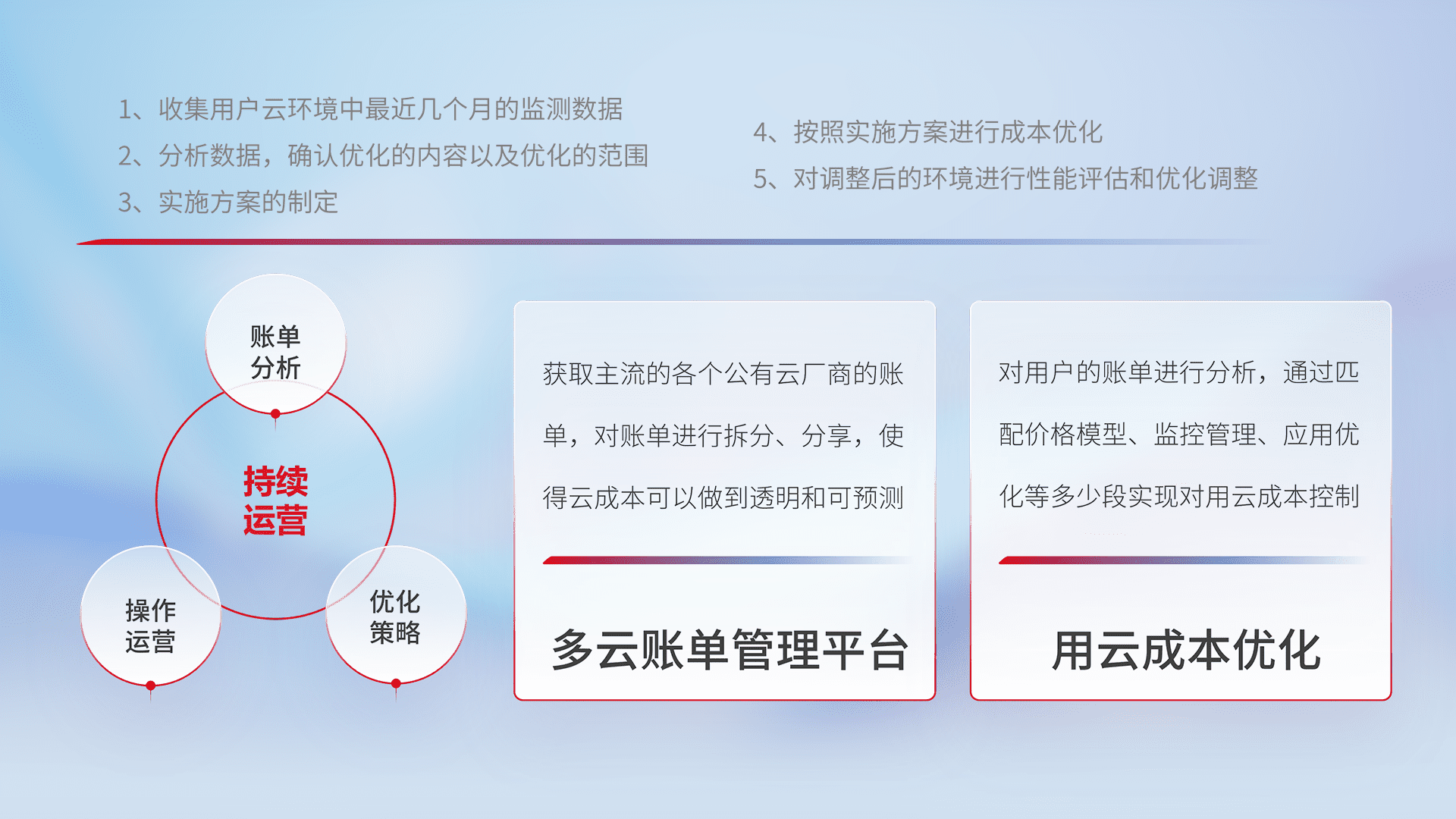 通过多云纳管,,以统一的资源数据模型把客户的云资源进行抽象和封装,,,,进而实现对多云资源的统一操作,,,,保障云资源管理的可靠性、、、稳定性与可用性。。。量身定制化运维内容,,,,配置、、、、开发运维、、、、补丁管理、、、备份、、、监控、、认证和访问管理、、审计和日常巡检等,,保障在用云过程中的可靠度,,,稳定度以及高可用率。。。。